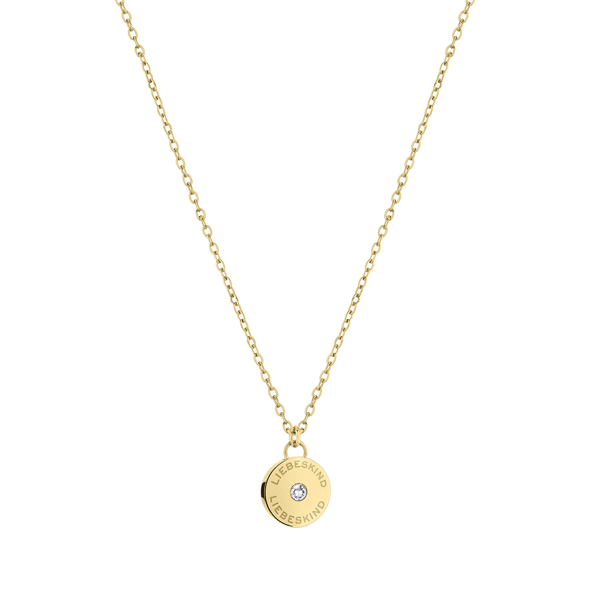 Liebeskind Berlin Halskette bestehend aus einer goldenen Ankerkette und einem goldenem, runden Anhänger mit Logoaufdruck und Zirkoniastein; Produktbild